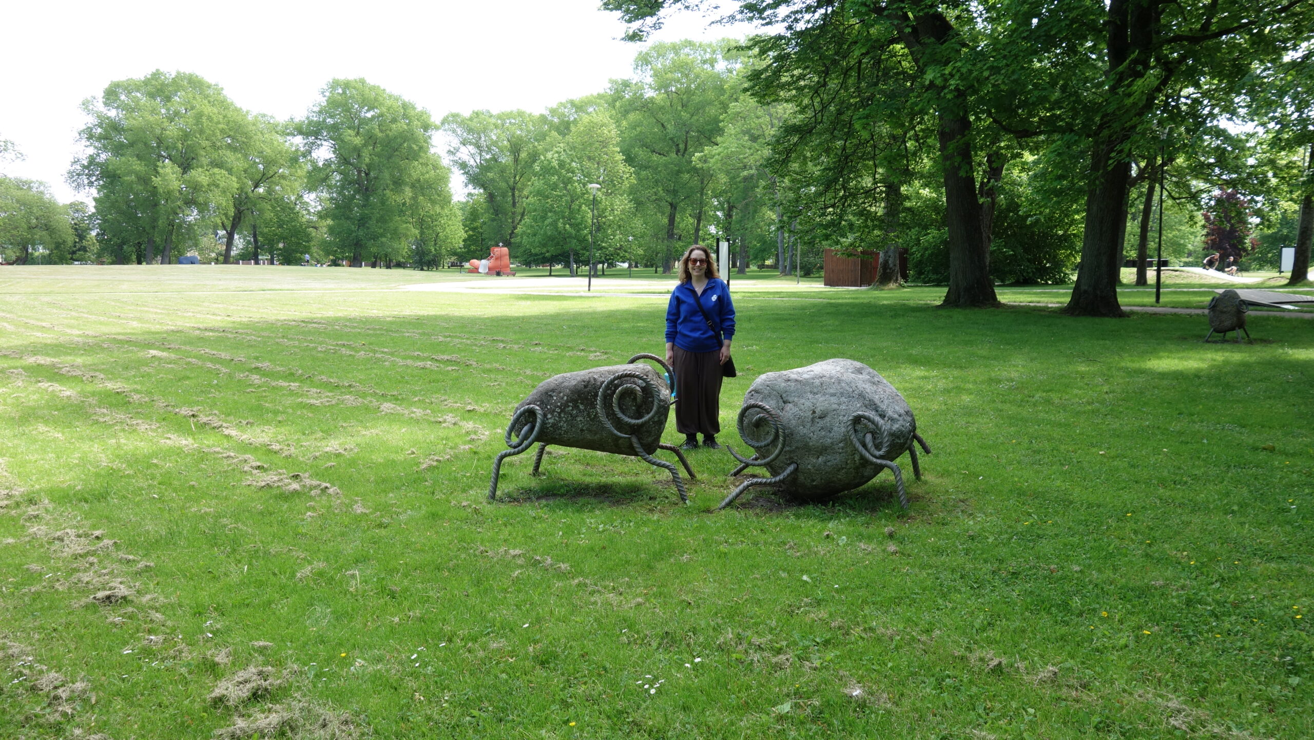 We headed off south and west to a park Mer wanted to see. We just strolled along, enjoying seeing things and the nice day. We were walking along a well-shaded path, and so the sun wasn’t an issue. The park itself was great, in the way we had seen in Lithuania. There was a kids’ area, and an exercise area. What was different was that there were quirky sculptures all over – a hat, some buttons, some rock sheep and bulls, a lobster, a shoe with a tongue you could climb. It also had a very impressive bike/skate/scooter park. It wasn’t just a concrete wall to do tricks off of. It was paved with multiple tracks going over bumps and hills and corners and valleys. It seemed very popular, and I can see why. We strolled the park and sat and people watched.