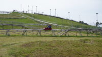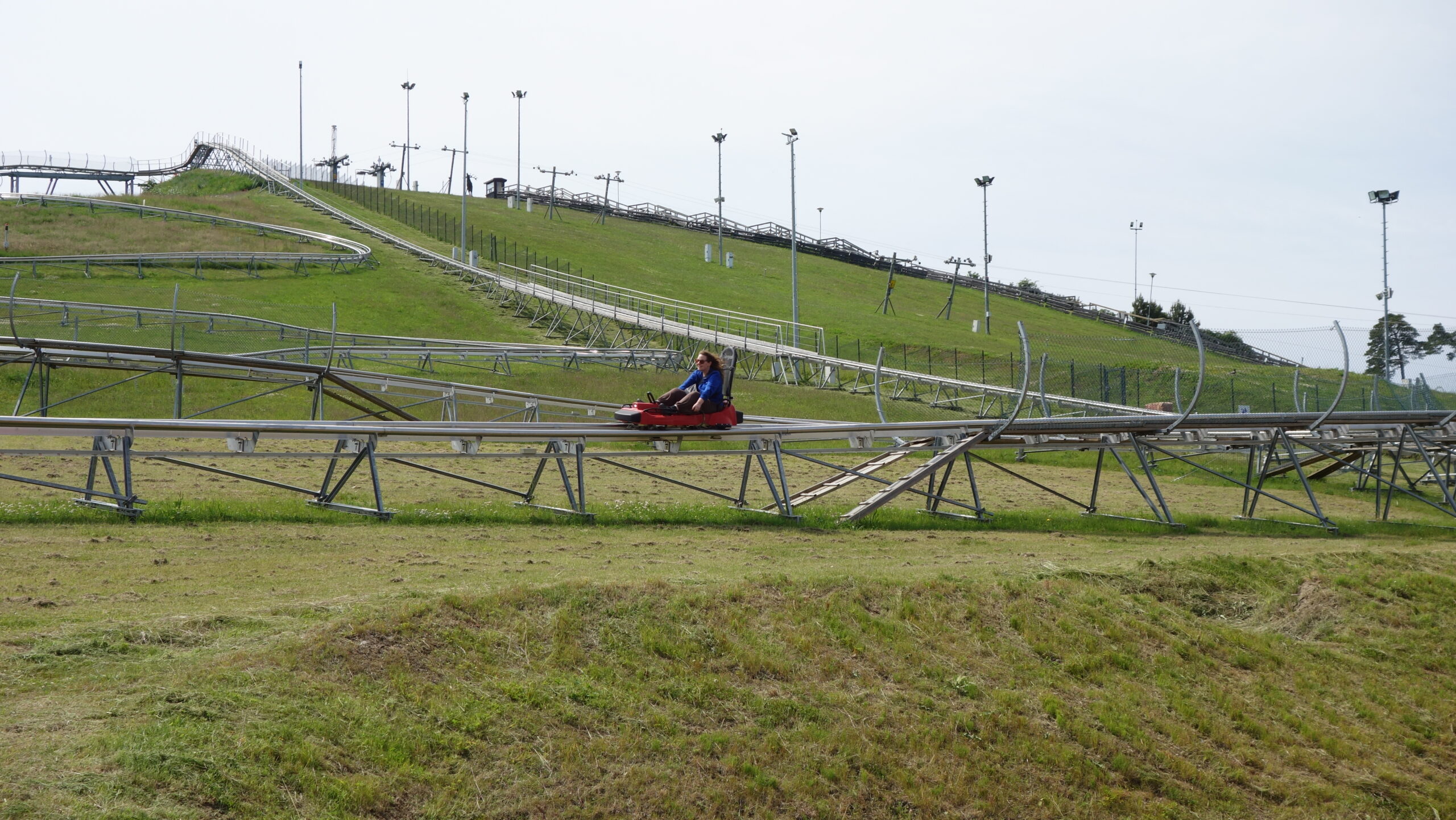 From the park, we walked a long ways southwest to an “adventure park” that had kids’ rides, a disc golf course, an innertube slide, and, most importantly for us, an alpine slide. We had found and ridden one two years ago in Lithuania, and so now we’ve covered slides in two thirds of the Baltic states (you’re on notice, Estonia!). The slide was short (only eight hundred meters long, including the ascent hill), but it was kicky. Slide designers can do some wonderful things with tight turns when they lack overall hill size. We both rode it twice, and had a great time.